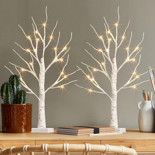 Set of 2-Vanthylit White Christmas Tree with Lights 2FT Tabletop Birch Tree with 24 Warm White LEDs Battery Operated Light up Twig Tree for Home Party Wedding Easter Christmas Decoration