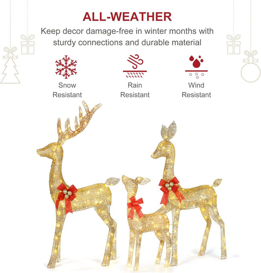 HOYECHI Lighted Christmas Decoration Deer 3 Piece, Light up Christmas Decor Reindeer Family Set for Indoor Outdoor Front Yard Porch with LED Lights, Plug, Extension Cord, Ground Stakes - Gold