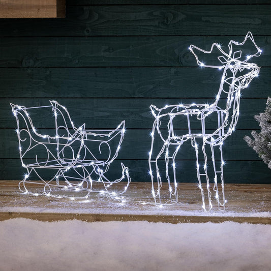 Christow Christmas Reindeer Sleigh Light Up Outdoor Decoration, Energy Efficient LED White Wire Flashing Garden Silhouette, Mains Powered