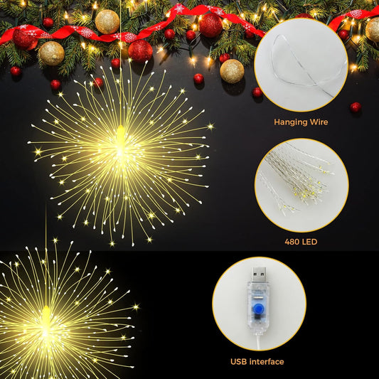 CNMTCCO Christmas Fairy Lights, 4 Pack Hanging USB Firework Lights 480pcs led 8 Modes,Globe Waterproof Copper Wire Lights,Suitable for Home Christmas Halloween Outdoor Party Backyard Decoration