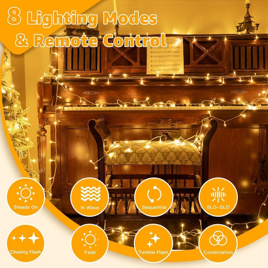 Ollny 20m 200 LED Fairy Lights Mains Powered, Outdoor Waterproof String Light with Remote/Plug/Modes/Timer, Bright Warm White Lighting Outside Indoor Garden Tree Party Wedding Decorations