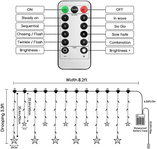 Jsdoin Christmas LED Stars Curtain Lights,12 Stars 138 Window Curtain String Lights with 8 Flashing Modes Decoration for Wedding, Party,Wall, Home Decorations,USB/Battery Powered (Warm White)