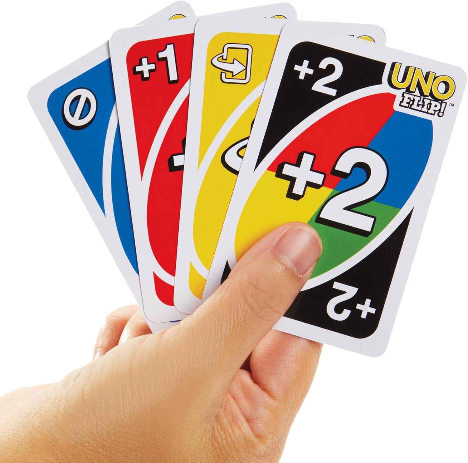 - Mattel Games UNO FLIP! Family Card Game, with 112 Cards in a Sturdy Storage Tin, Makes a Great Gift for 7 Year Olds and Up, GDG37