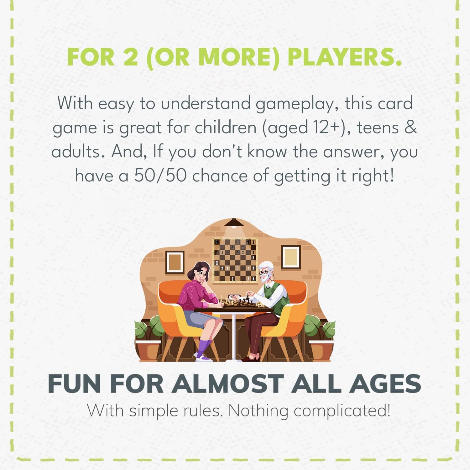 - Fun for all: For 2 (or more) players. With easy to understand game play, this card game is great for children (aged 12+), teens & adults. And, If you don't know the answer…you have a 50/50 chance of getting it right!