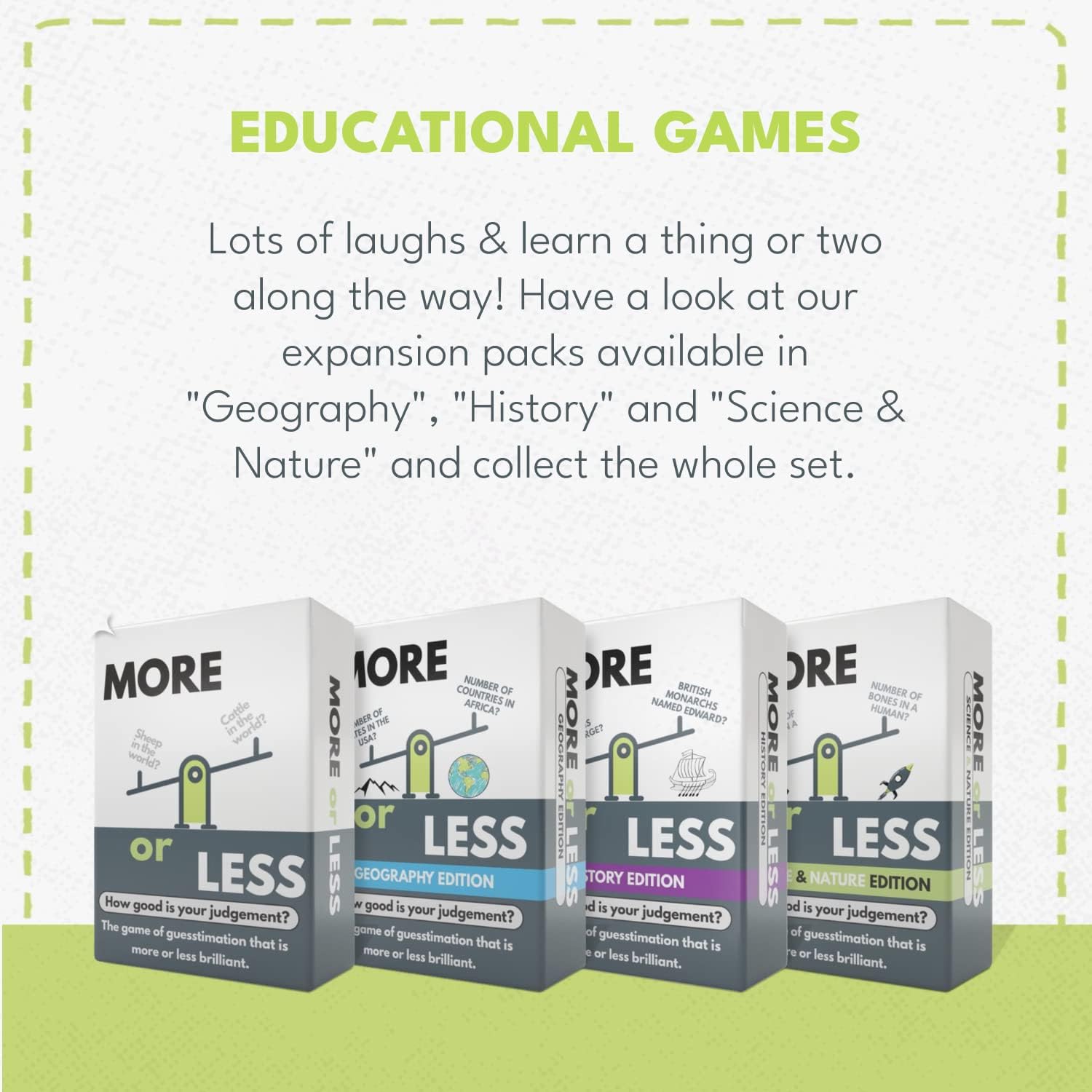 - Educational Games: Lots of laughs & learn a thing or two along the way! Have a look at our expansion packs available in "History", “Geography”, "Science & Nature" and “Sports” and collect the whole set!