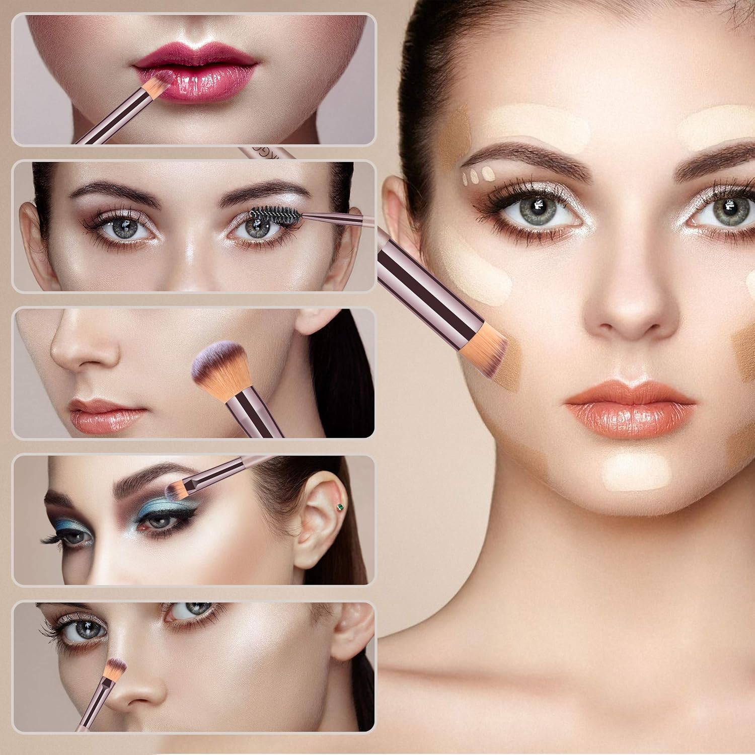 - Professional Makeup Brush Set: A set of 15 makeup brushes in champagne gold looks. Includes foundation brush, kabuki face brush, powder brush, eyeliner brush, eyebrow brush, eye shadow brush, angled brush, concealer brush, blush brush, contouring brush, blending brush and more. Plus a cosmetic bag in the same style