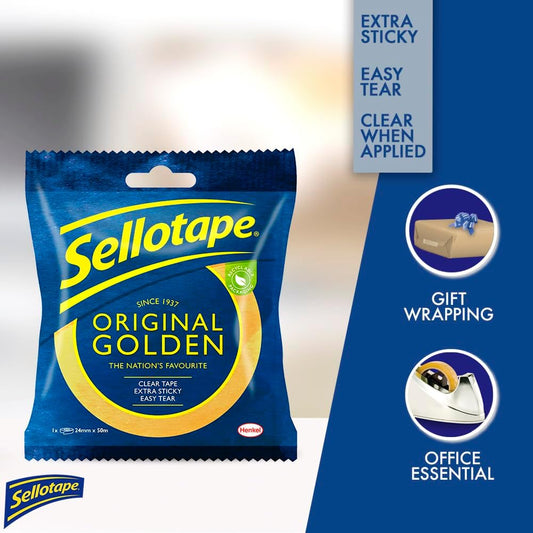 Sellotape Original Golden, Multi-Purpose Clear Tape for Household Objects, Clear Packing Tape for Sticking Envelopes or Cards, Easy to Use Packaging Tape, 24mmx50m