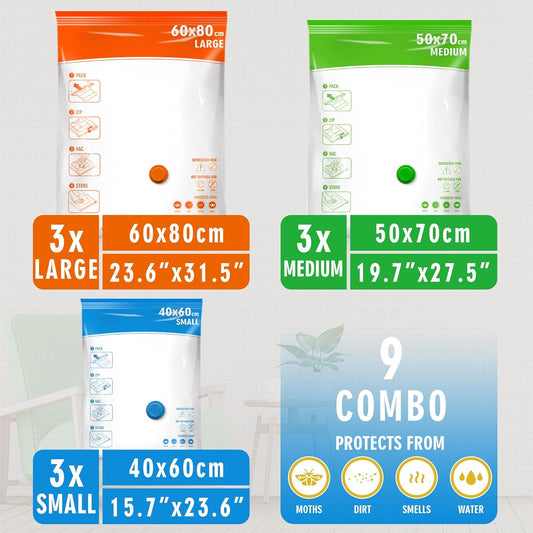 Storage Master Space Saver Bags for Travel and Home Reusable Vacuum Storage Bags Save 80% More Storage Space Work with Vacuum Cleaner (9 Combo, No Pump Included)