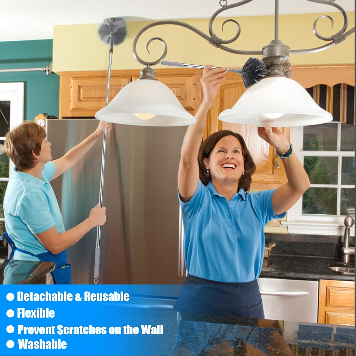 - 【Expandable Duster】The duster designed for cleaning handle can extend from 16 inches to 84 inches, plus the feather duster head can reach up to 100 inches. The length can be adjusted manually, so it can not only clean low tabletops and sofas, but also the tops of refrigerators and air conditioners without risking climbing a ladder to remove dust.