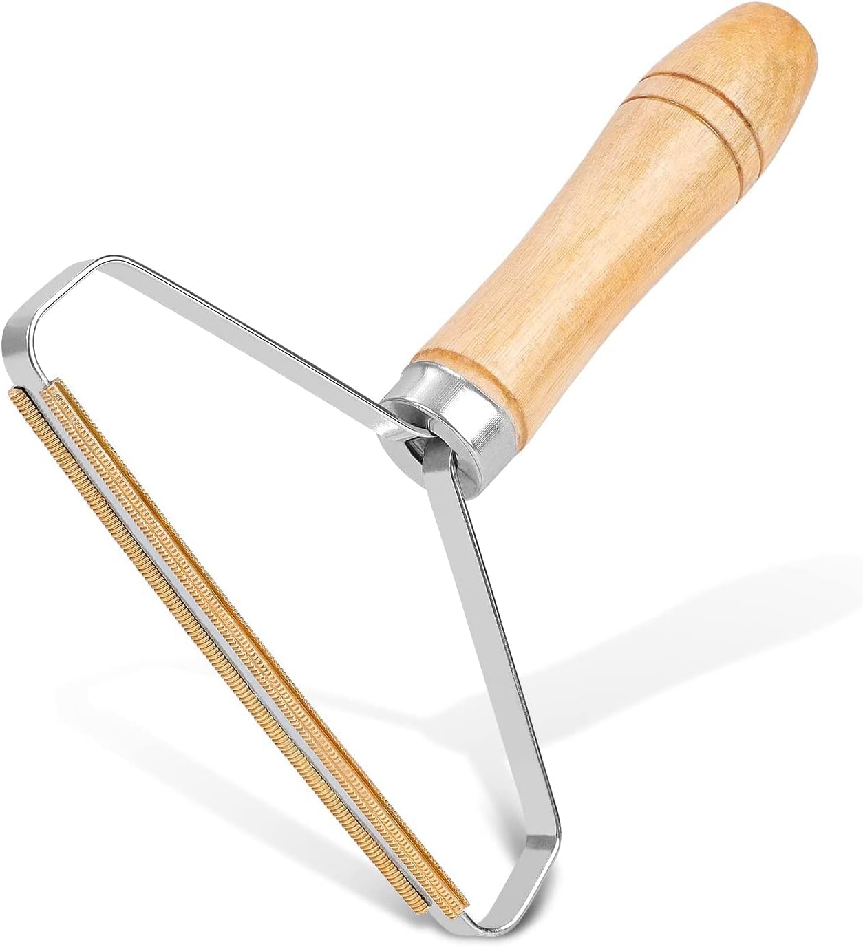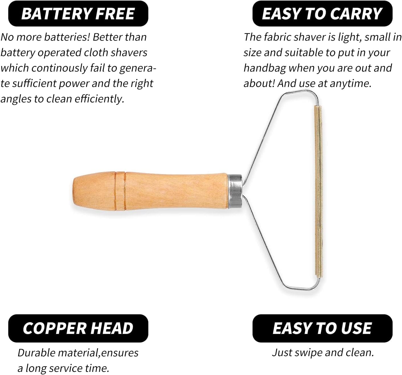 - [Durable Material]: Pet hair remover is made of pure copper, sturdy and durable, can ensure a long service time, 100% non-toxic and environmentally friendly. The portable clothing fluff razor is ergonomically designed and equipped with an easy-to-grip wooden handle to ensure maximum comfort.