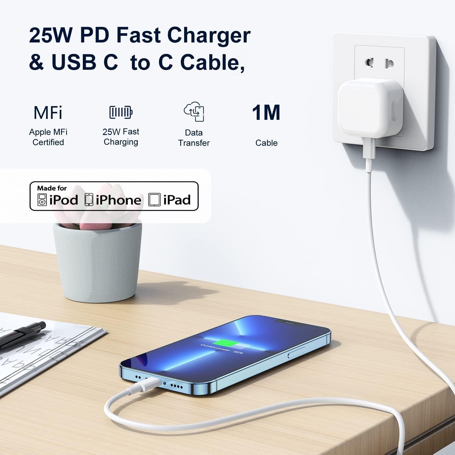 - What You Get:1-Pack 25W USB C iPad charger + 1-Pack 3FT USB C to C cable,which can satisfy the needs of multiple iphone devices in different places. We are confident in the long-lasting performance of the certified USB C iPhone wall charger and cord. Any questions, don't hesitate to contact us! We will solve your problems within 24 Hours!