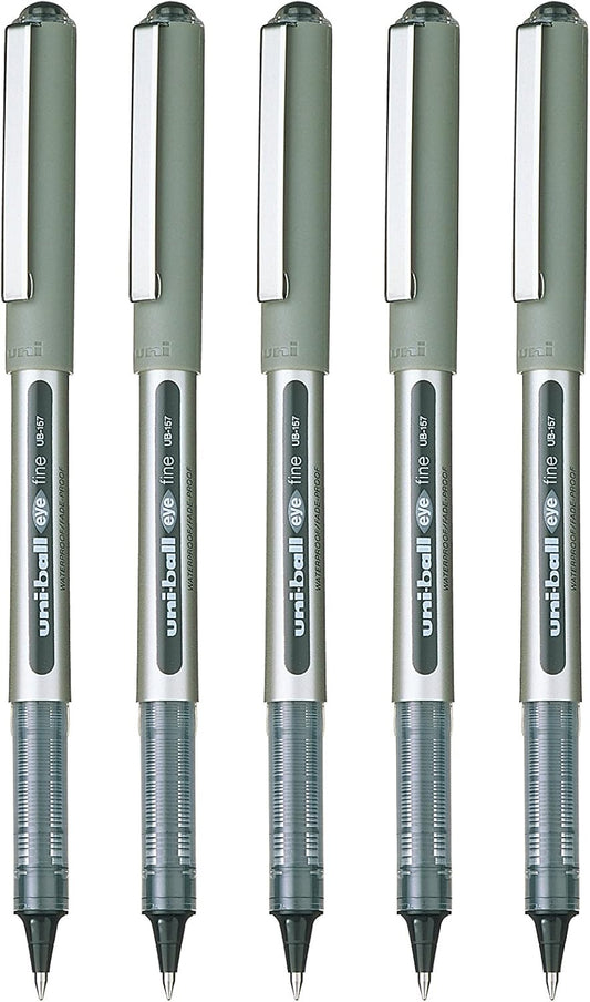 Uni-ball UB-157 Eye Black Rollerball Pens. Premium Fine 0.7mm Ballpoint Tip for Super Smooth Handwriting, Drawing, Art, Crafts and Colouring. Fade and Water Resistant Liquid Uni Super Ink. Pack of 5