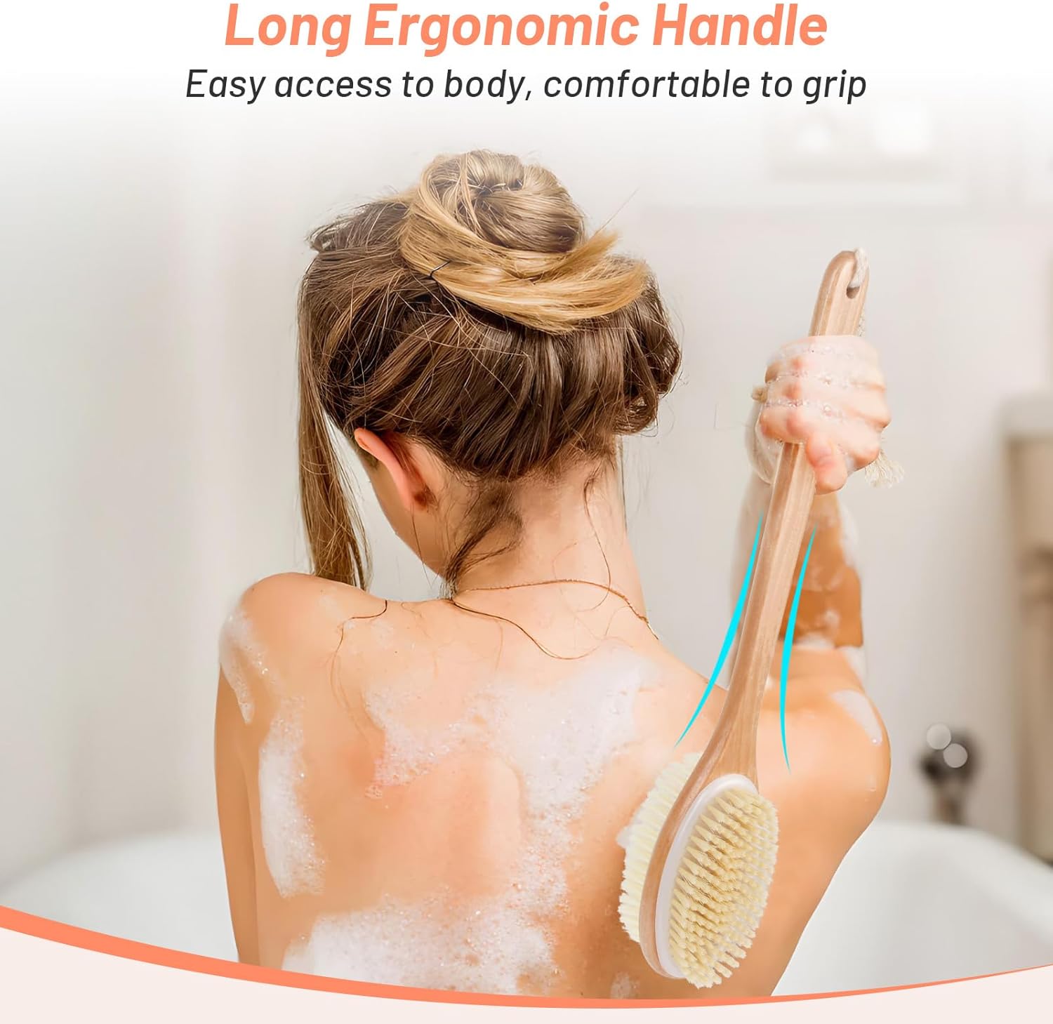 - Ergonomic Long Handle:43cm ergonomic long handle back brush allows easy access to all body areas, reducing the need for repeated bending or twisting, thus alleviating strain on joints and muscles.