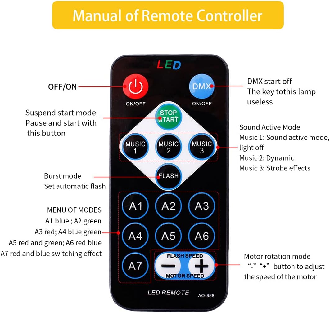 - Mode: You can set the desired mode (music control mode, remote control mode, automatic mode) and light brightness. Then press "+" or "-" to adjust the speed of light movement.