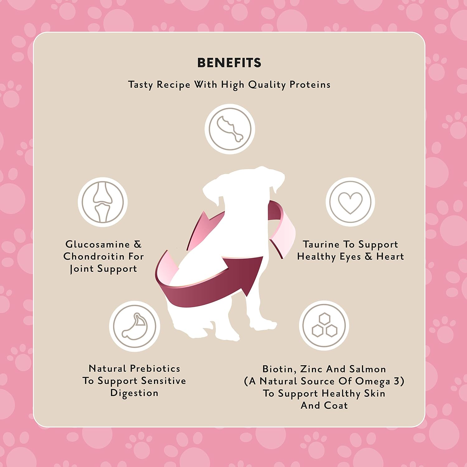 - Biotin, Zinc and Salmon (A natural source for Omega 3) to support healthy Skin and Coat