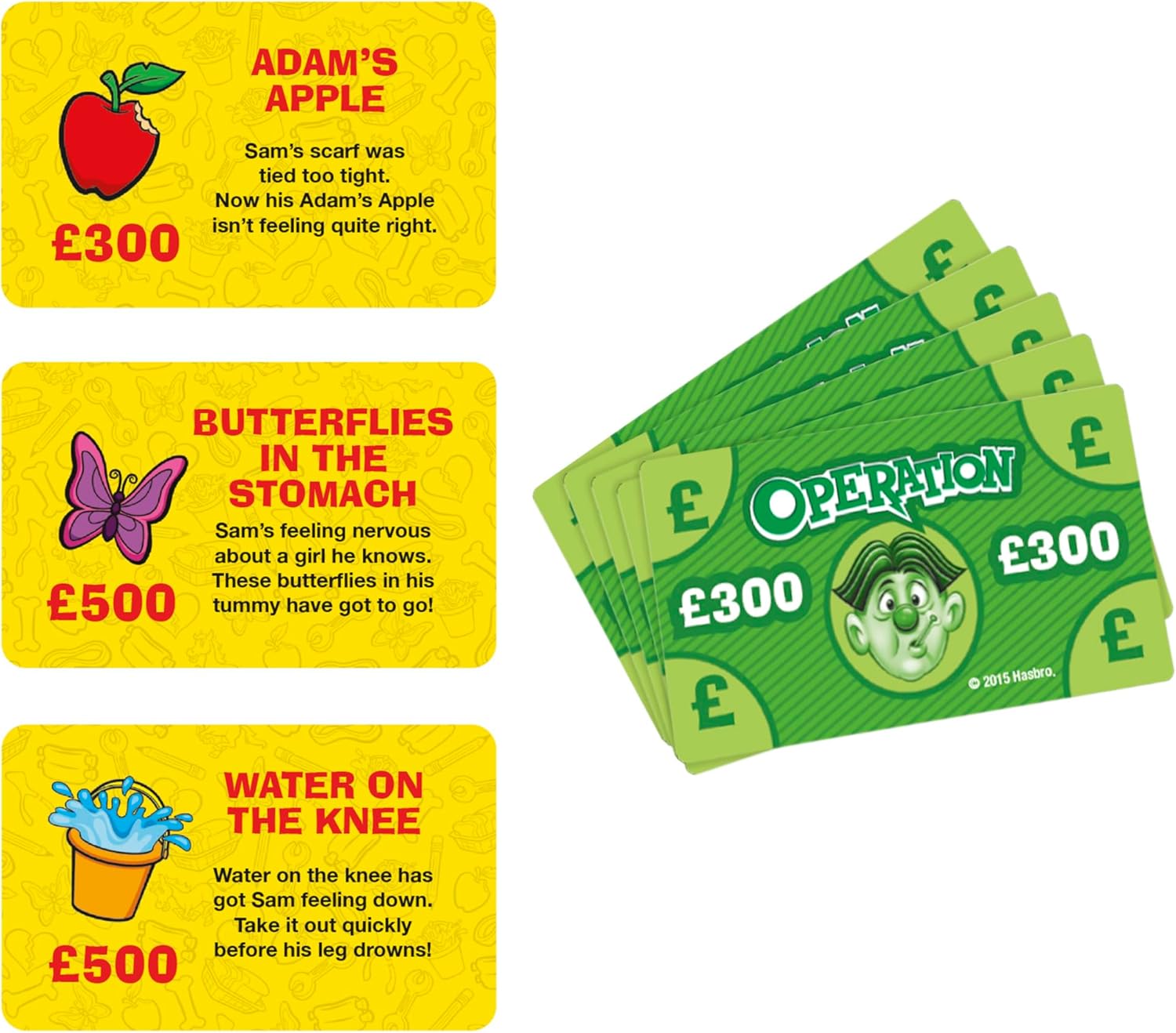 It's the Operation electronic board game, a game night favorite, featuring hilarious ailments! The patient, Cavity Sam, is a little under the weather. Who can avoid the buzz and help him recover without lighting up his red nose? Players choose a Doctor card with 12 possible wacky anatomy parts to remove. Just steer clear of the sides of the game unit to avoid the dreaded buzzer! If they don't set off the buzzer, they earn the amount of money shown on the back of the card. The player with the best skills and the most money at the end of the game wins. A beloved children's game for ages 6 and up, it's fun for the whole family on Family Game Night and a laugh-out-loud game for playdates. Looking for fun gifts for kids? Classic board games for families make great kids gifts any time of the year! Operation and Hasbro Gaming and all related terms are trademarks of Hasbro.