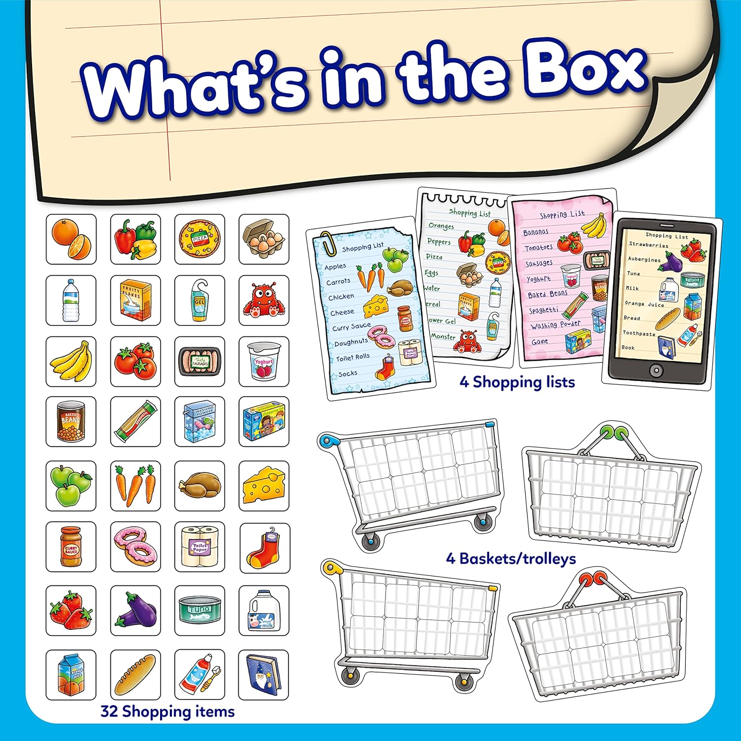 - IN THE BOX: Our Shopping List board game for 3 year olds and up includes 32 grocery picture cards, 4 shopping lists, and 4 different coloured baskets/trolleys. Add on packs are available to increase play value.