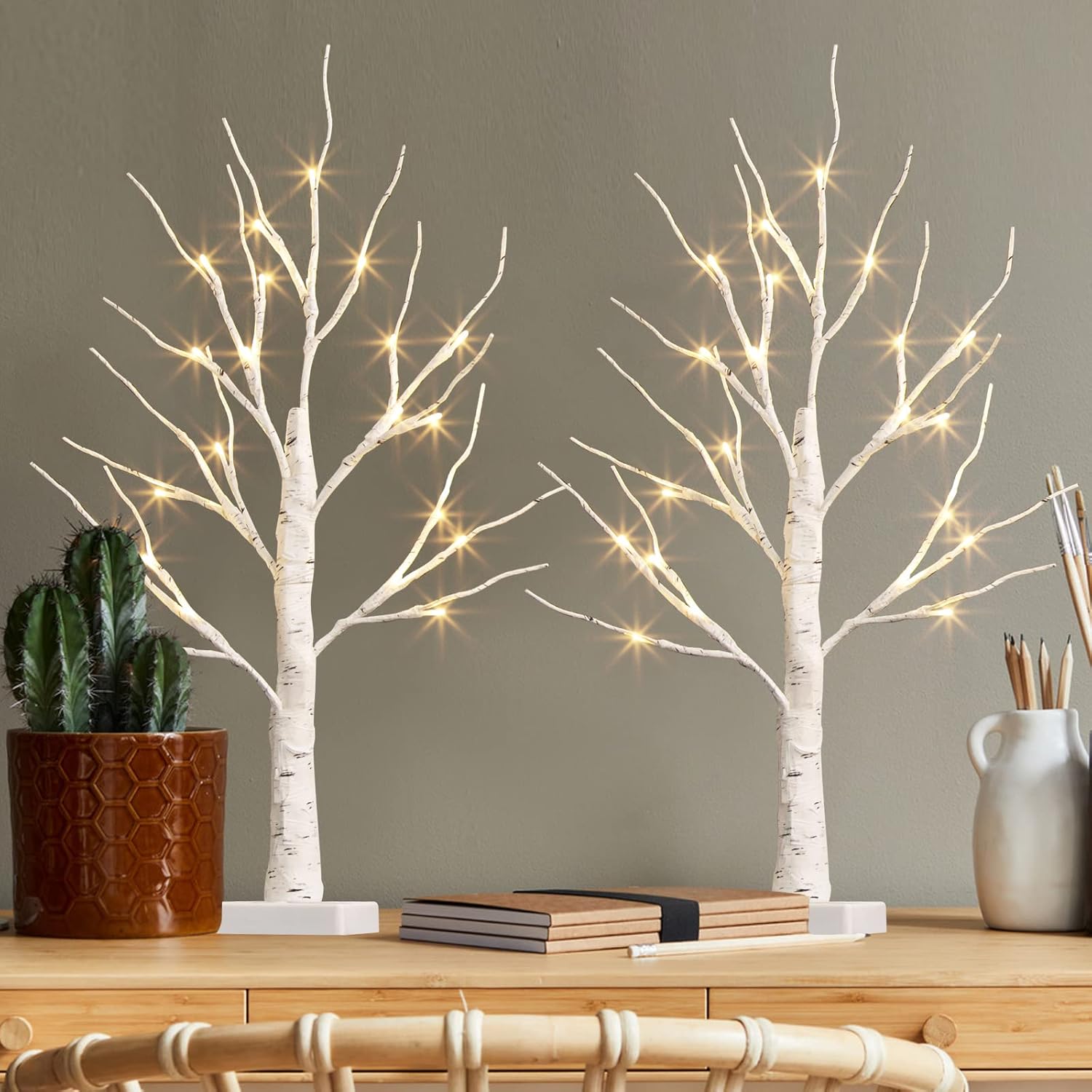 - 【Twig Tree with Lights】: Set of 2 2FT white birch trees, each with a solid 10 * 10cm base and 24 LED warm white LED lights, adding your room a trace of luxury and elegant especially when lit up.