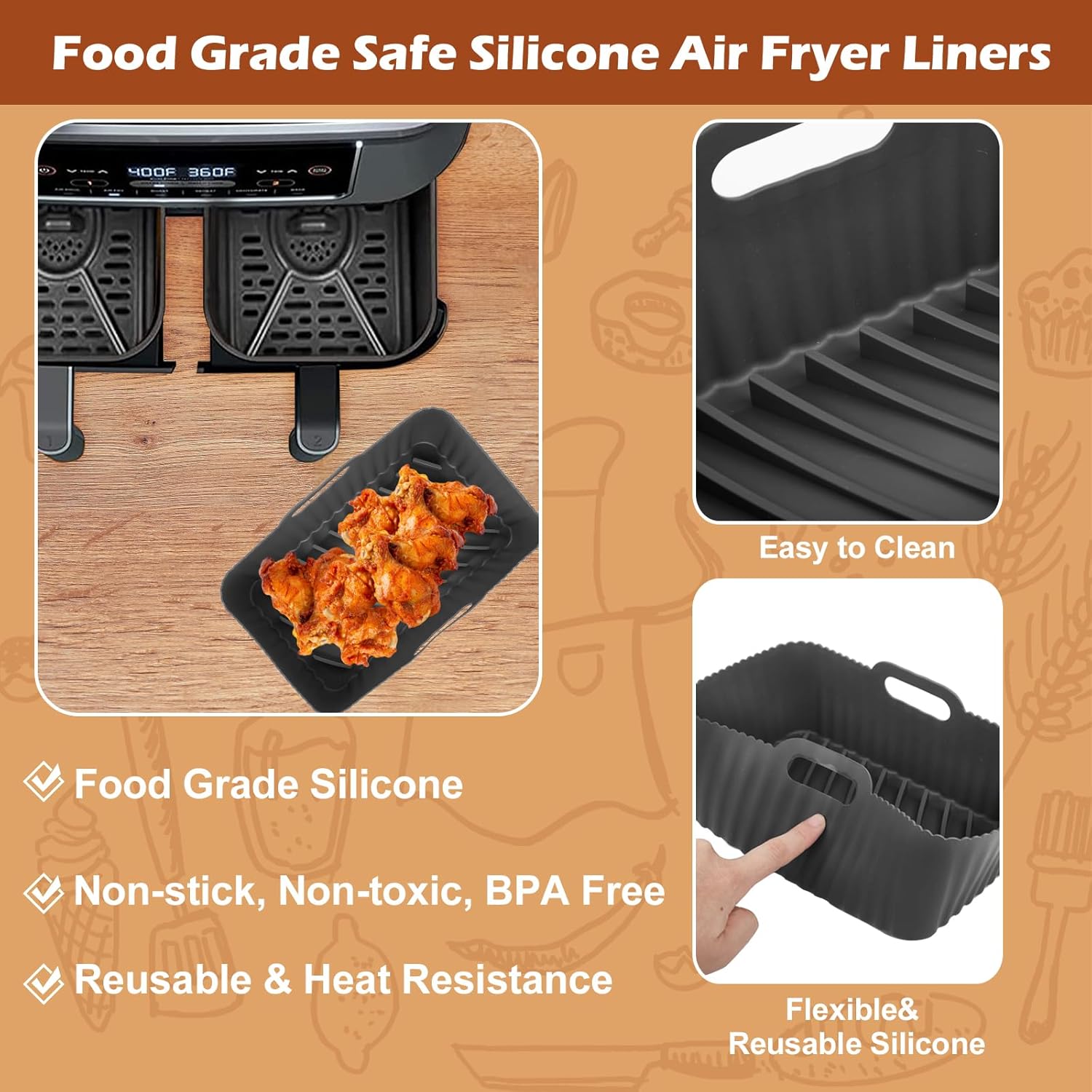 - 【Widely Use】2 Pack silicone air fryer liners suit for dual air fryers like Ninja AF300UK, Salter and other dual zone air fryers. Also can be used for food reheating, broiling, roasting, baking and dehydrating. Oven, microwave, Steamer, freezer, and dishwasher safe.