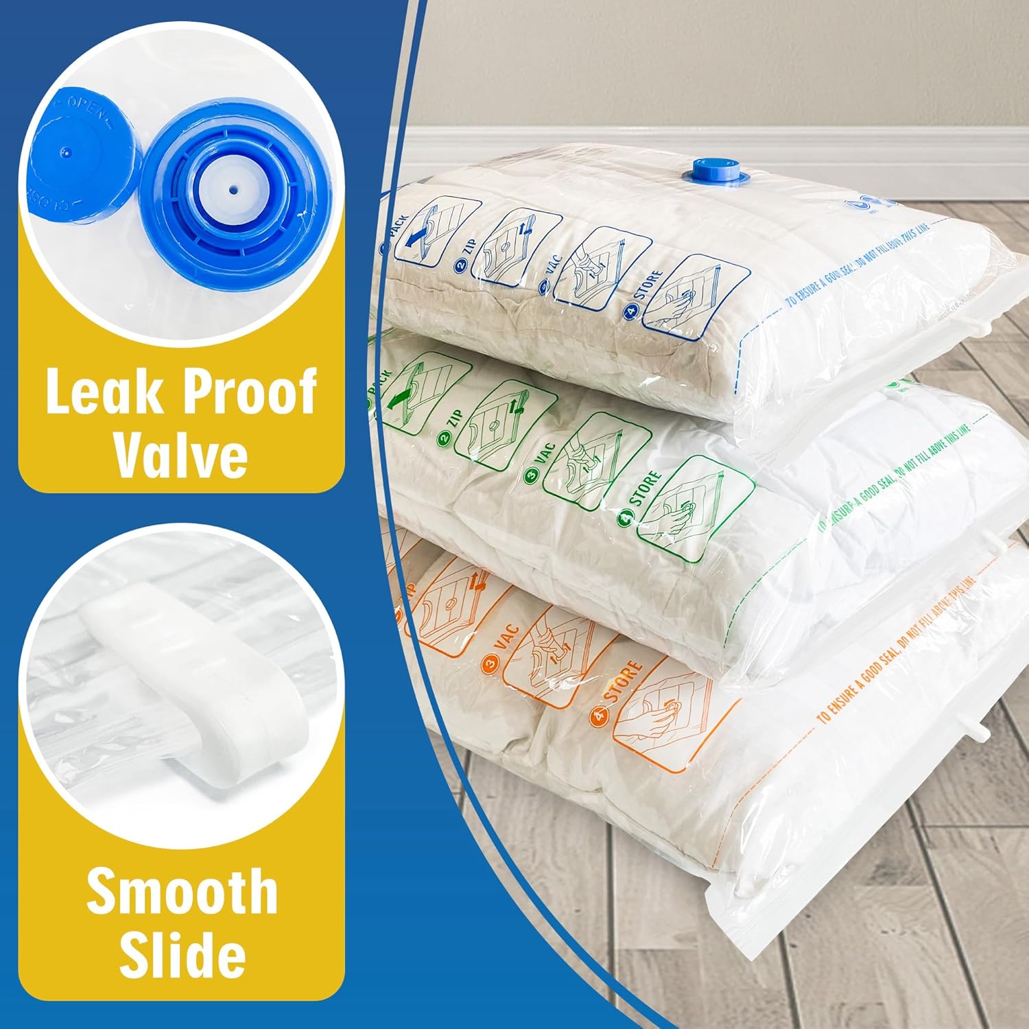 - Secure Vacuum Sealer Bags clothes: these vaccume storage bags have advanced double-zip seal and the triple-seal valve designed to suck every bit of air out and nothing back in.